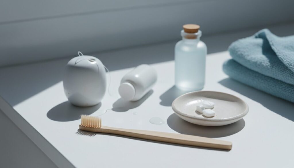 また、洗口液の使用もお勧めしています。歯ブラシやフロスでは届きにくい部分の細菌を減らすことができます。ただし、アルコール濃度の高い洗口液は、仮歯の素材に影響を与える可能性があるため、使用前にご相談ください。